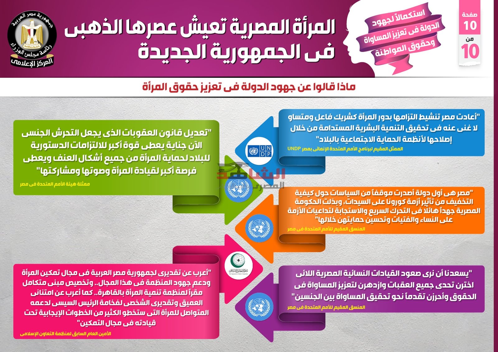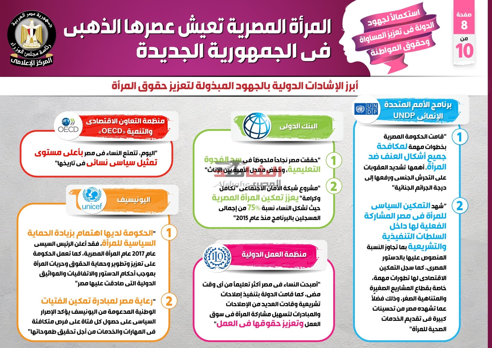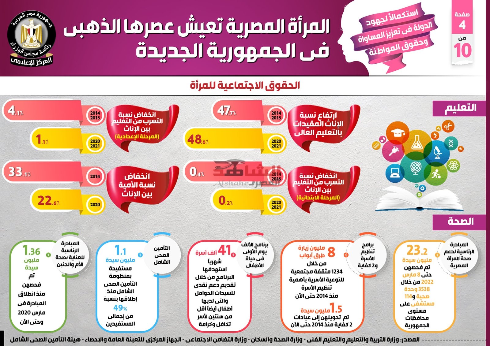 وفي هذا الصدد نشر المركز الإعلامي لمجلس الوزراء تقريراً تضمن إنفوجرافات تحت عنوان ” المرأة المصرية تعيش عصرها الذهبي في الجمهورية الجديدة ” وذلك في ضوء استكمال الدولة لجهودها في تعزيز المساواة وحقوق المواطنة.