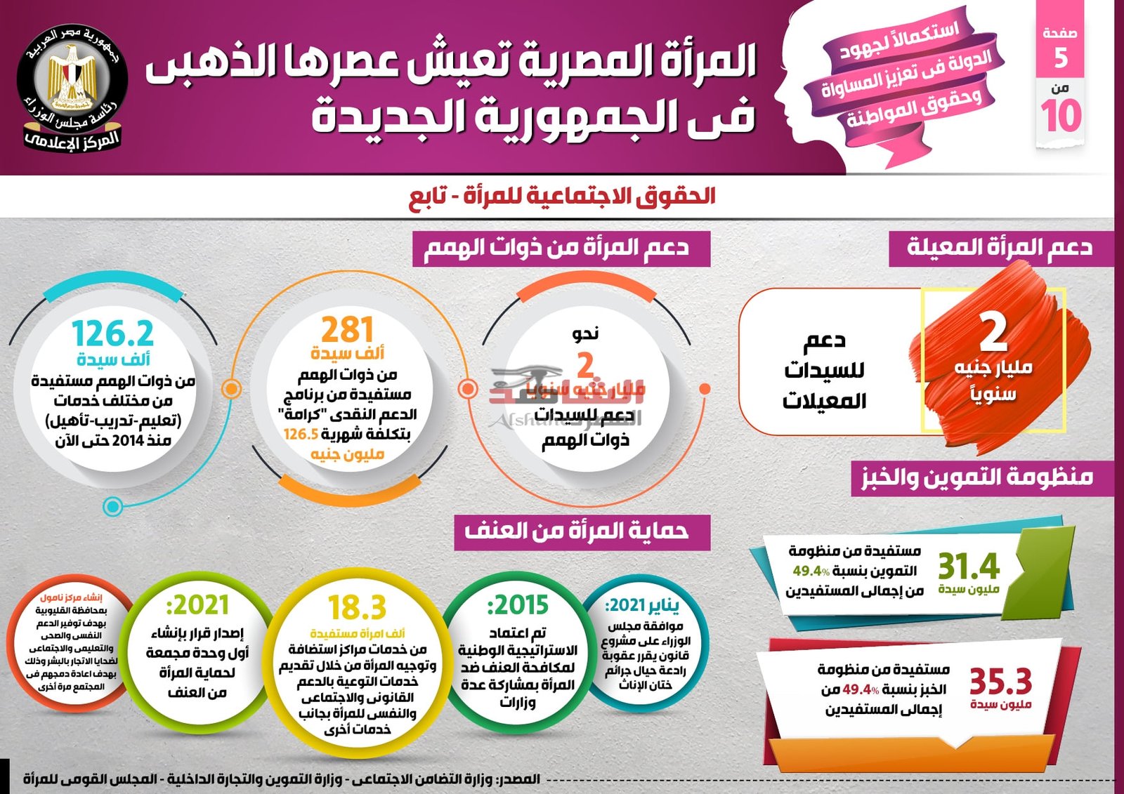 وفي السياق ذاته، شملت الحقوق الاجتماعية للمرأة أيضاً بحسب التقرير، تقديم دعم بقيمة 2 مليار جنيه سنوياً للسيدات المعيلات، كما استفادت 126.2 ألف سيدة من ذوات الهمم من مختلف خدمات التعليم والتدريب والتأهيل منذ 2014 حتى الآن، فضلاً عن استفادة 281 ألف سيدة من ذوات الهمم من برنامج الدعم النقدي “كرامة” بتكلفة شهرية 126.5 مليون جنيه، هذا وتصل قيمة الدعم المقدم لذوات الهمم نحو 2 مليار جنيه سنوياً.