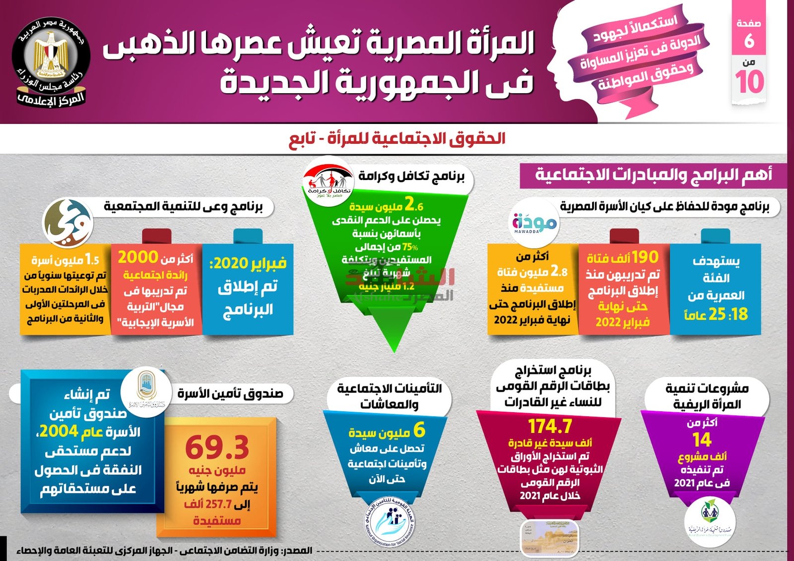 وبالنسبة لأهم البرامج والمبادرات الاجتماعية، أظهر التقرير أنه فيما يخص التأمينات الاجتماعية والمعاشات، تحصل 6 مليون سيدة على معاش وتأمينات اجتماعية حتى الآن، بالإضافة إلى إنشاء صندوق تأمين الأسرة عام 2004، لدعم مستحقي النفقة في الحصول على مستحقاتهم، حيث يبلغ ما يتم صرفه شهرياً 69.3 مليون جنيه إلى 257.7 ألف مستفيدة.