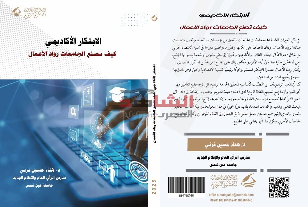 صدر حديثًا للدكتورة هناء حسين قرني، كتاب جديد بـ عنوان “الابتكار الأكاديمي ، كيف تصنع الجامعات رواد الأعمال ، رؤية نظرية وتطبيقية “، والصادر عن دار العلا للنشر والتوزيع لعام 2025 .و يتكون الكتاب من أربعة فصول رئيسية